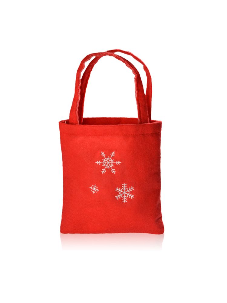 Czerwona filcowa torebka na prezent z motywem płatków śniegu. Torba jest wykonana z wytrzymałego i przyjemnego w dotyku filcu, wyposażona jest w wytrzymałe rączki. Posiada dużą powierzchnię znakowania po obydwu stronach.