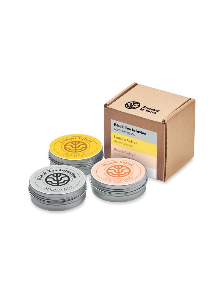 Podróżny zestaw upominkowy marki Branded By Earth. Zawiera 3 sztuki 50 gr wegańskich produktów do pielęgnacji ciała, twarzy i włosów. Każdy zapakowany puszce. Całość w pudełku z papieru z recyklingu. Wyprodukowano w UE.