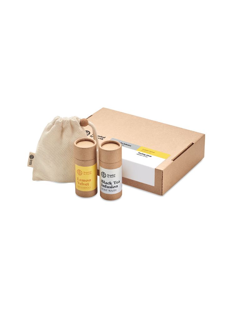 Zestaw upominkowy unisex On the Go marki Branded By Earth. Zawiera 24 wegańskie kostki o wadze 4g zapakowane w 3 tubach: do mycia ciała, włosów i do prania, w woreczku z bawełny organicznej. Każda tuba zawiera 8 sztuk. Całość w pudełku z papieru z recyklingu. Wyprodukowano w UE.