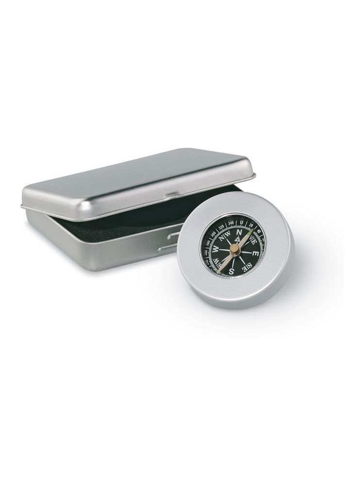 Aluminiowy kompas, klasyczny styl. Zapakowany w metalowe pudełko.
