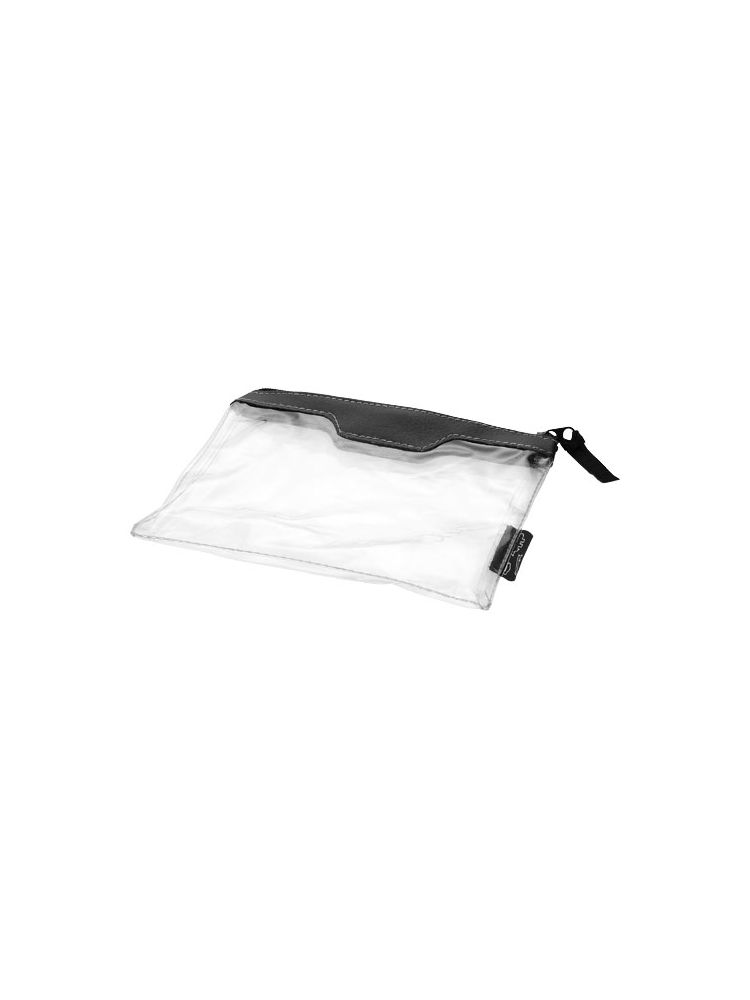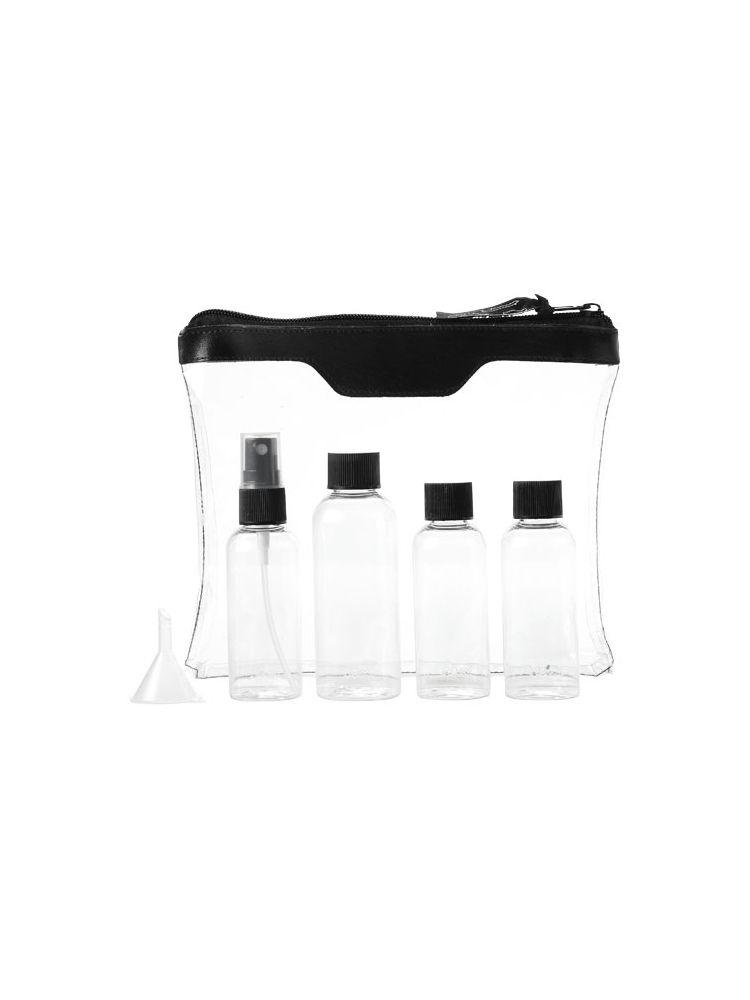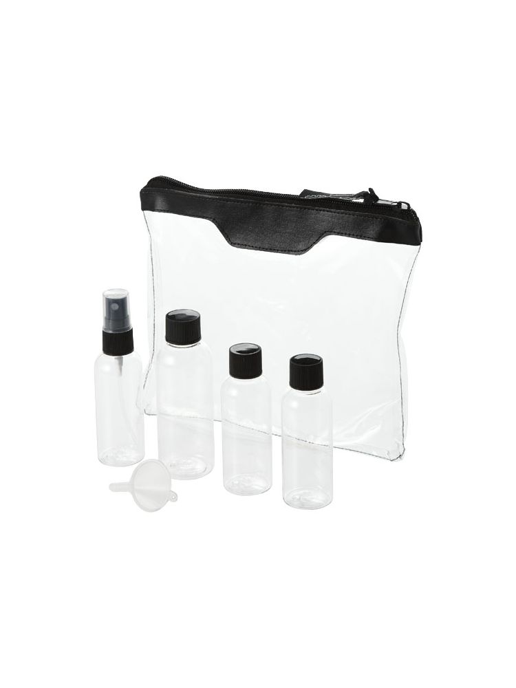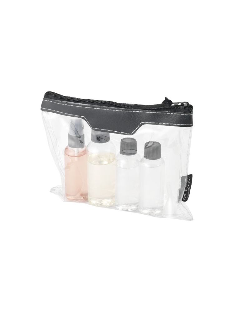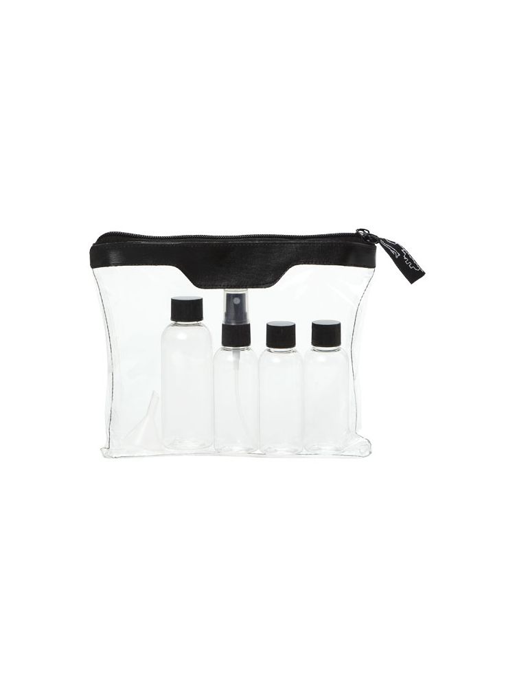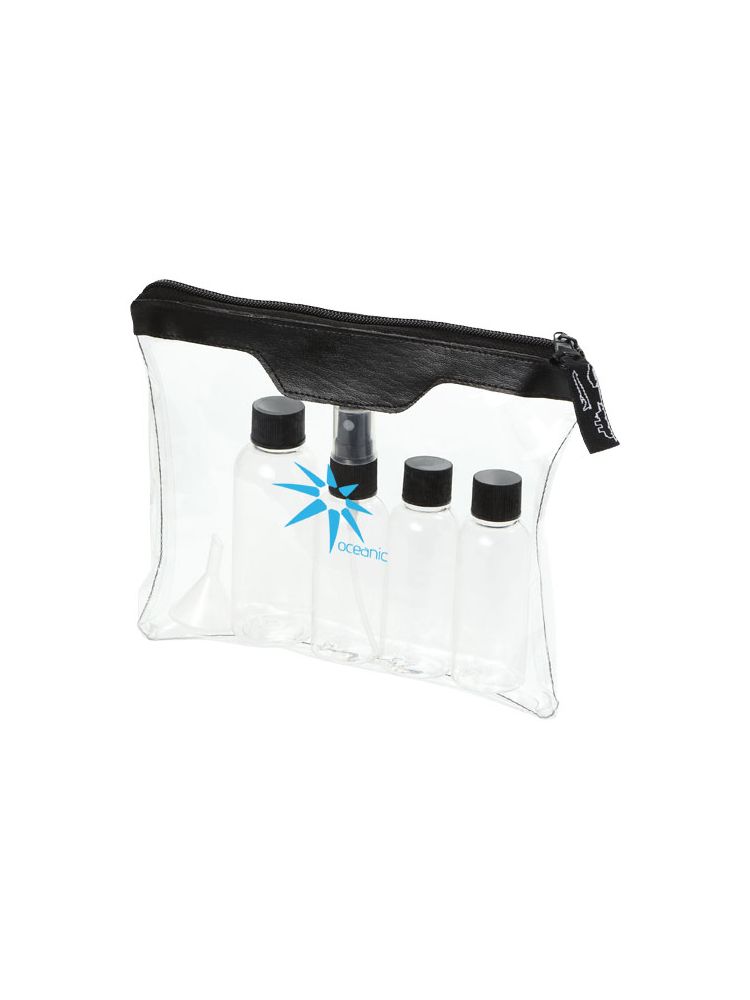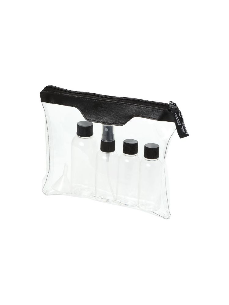 Zatwierdzona przez linie lotnicze transparentna kosmetyczka, której zawartość można wnieść na pokład. Zawiera: 2 puste buteleczki 50 ml, 1 pustą buteleczkę 80 ml, atomizer oraz lejek. Buteleczki, atomizer i lejek zapakowane oddzielnie od etui. Nadruk niemożliwy na poszczególnych elementach.