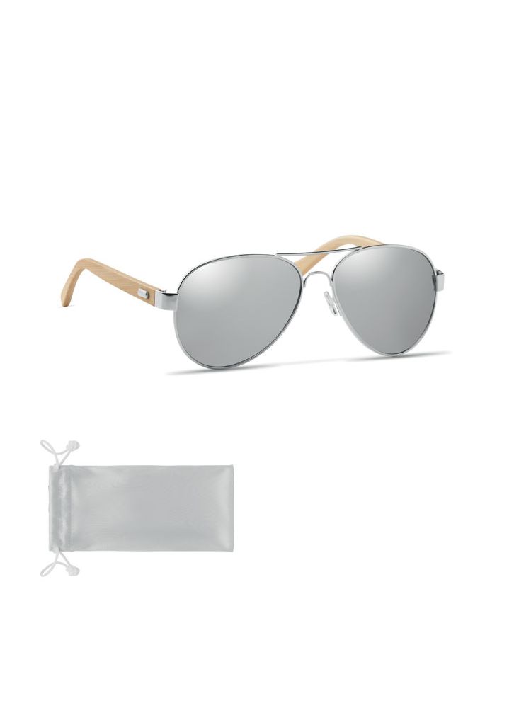 Okulary przeciwsłoneczne z bambusowymi zausznikami i kolorowymi lustrzanymi soczewkami w etui z mikrofibry. Ochrona UV400. Bambus jest produktem naturalnym, dlatego mogą wystąpić nieznaczne różnice w kolorze, wzorze i rozmiarze.
