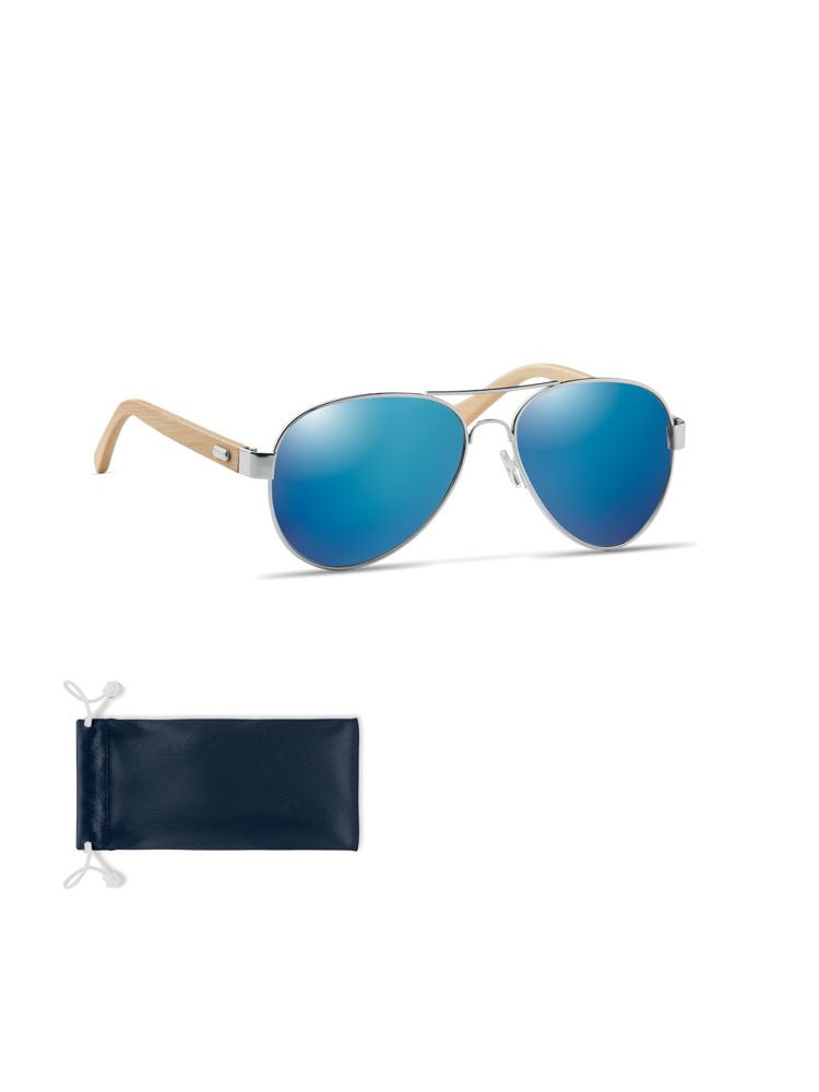 Okulary przeciwsłoneczne z bambusowymi zausznikami i kolorowymi lustrzanymi soczewkami w etui z mikrofibry. Ochrona UV400. Bambus jest produktem naturalnym, dlatego mogą wystąpić nieznaczne różnice w kolorze, wzorze i rozmiarze.