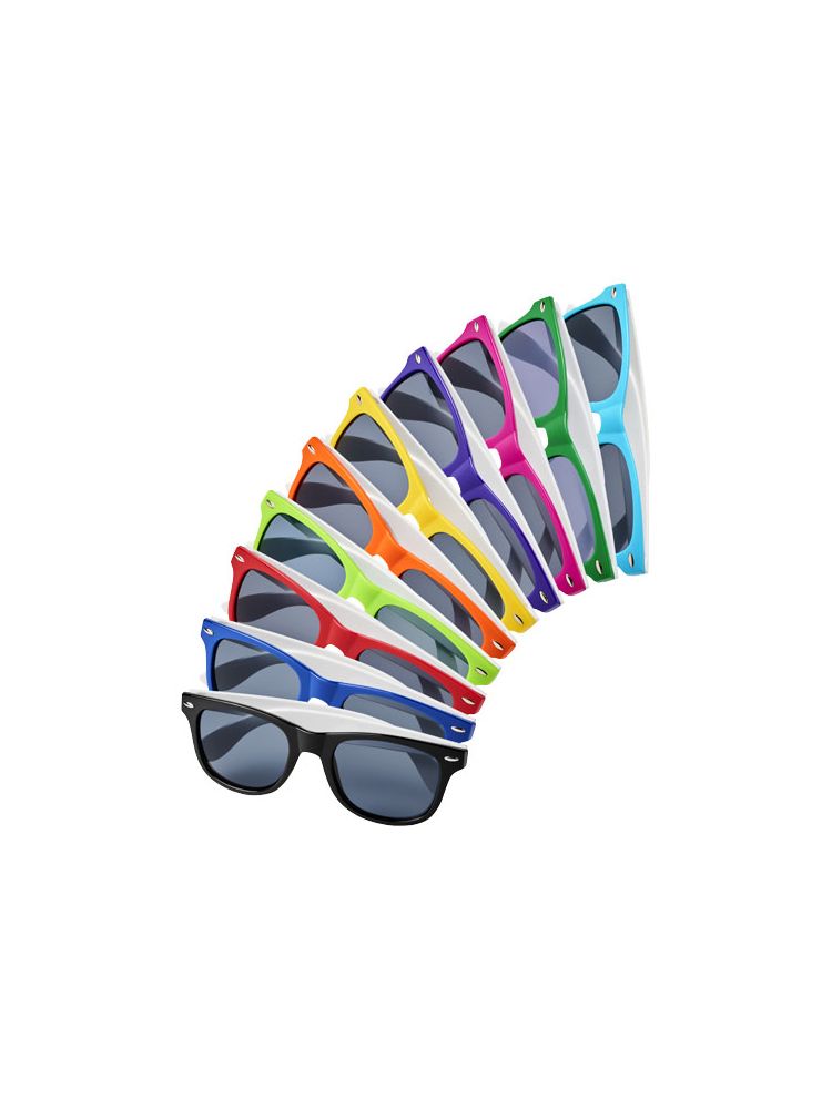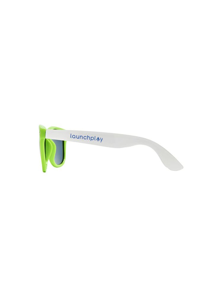 Okulary Sun Ray w stylu retro z białymi zausznikami dla możliwości umieszczenia większych dekoracji. Soczewki zaliczane są do kategorii 3 i są zgodne z normą EN ISO 12312-1 i UV 400.