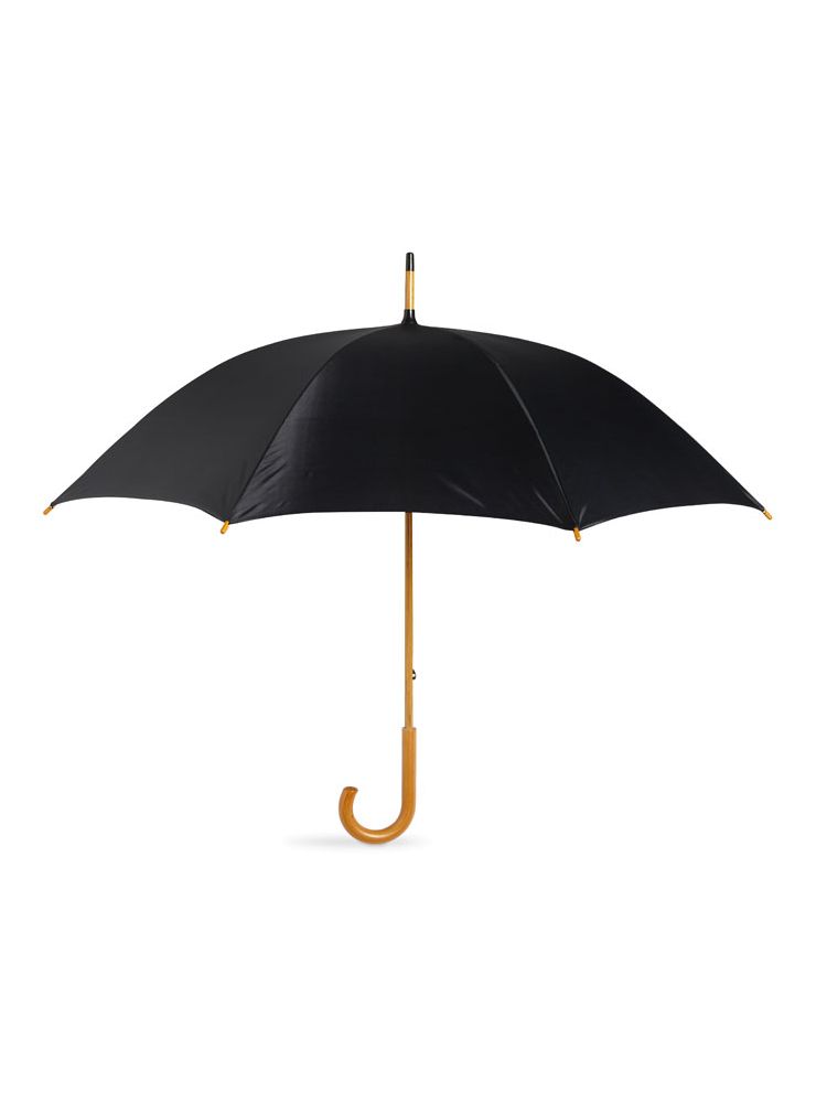 Parasol z drewnianą rączką, ręcznie otwierany i zamykany. Drewniany trzon, kocówki oraz szpic. Czarne, lakierowane żebra, drewniane wykończenia. Rozmiar: 23 cale Materiał: poliester 190T.