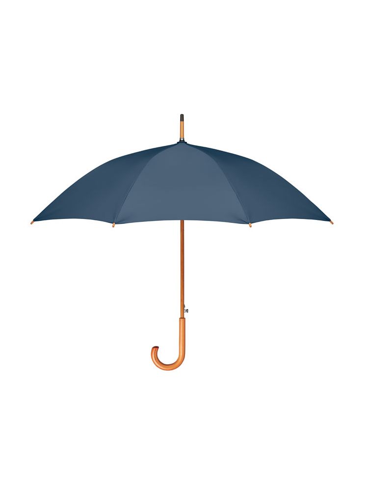 23 calowy automatyczny parasol z RPET pongee 190T, z drewnianym trzonem, końcówkami i zakończeniem. Czarne metalowe żebra. Zakrzywiony naturalny, drewniany uchwyt. Zamykany ręcznie.