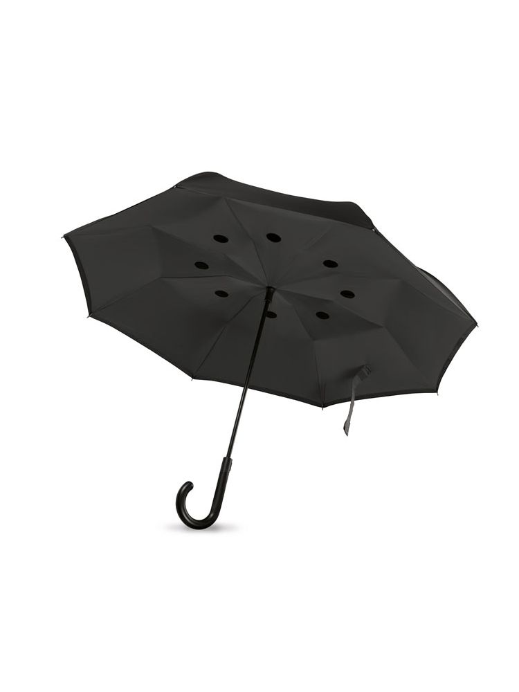 Parasol 23’‘, otwierany odwrotnie, podwójna warstwa, żebra i trzon z włókna szklanego, materiał 190T pongee. Otwierany manualnie, składany automatycznie.