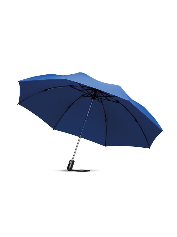 3-krotnie składany parasol 23’‘ z materiału 190T pongee, automatycznie otwierany/zamykany. Stalowy, chromowany trzon, żebra z włókna szklanego. Czarna rączka z ABS z przyciskiem. Dopasowany pokrowiec.