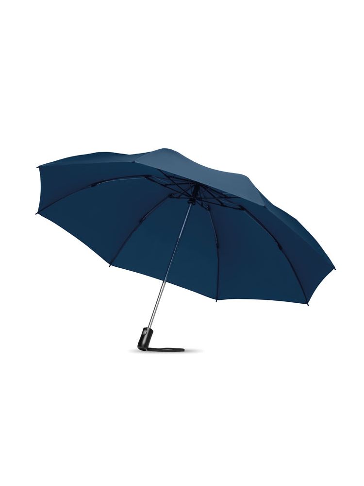 3-krotnie składany parasol 23’‘ z materiału 190T pongee, automatycznie otwierany/zamykany. Stalowy, chromowany trzon, żebra z włókna szklanego. Czarna rączka z ABS z przyciskiem. Dopasowany pokrowiec.