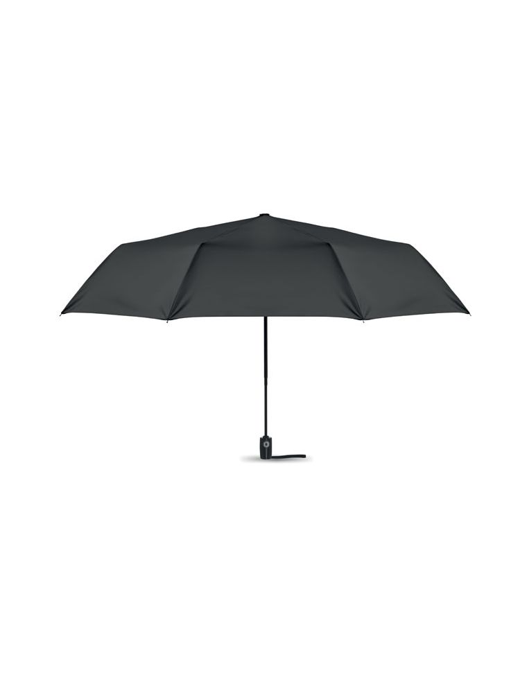27 calowy parasol wiatroodporny z systemem automatycznego otwierania i zamykania. Materiał 190T, trzon metalowy, czarne ożebrowanie wykonane z włókna szklanego. Czarna rączka z PP, z dopasowanym etui.