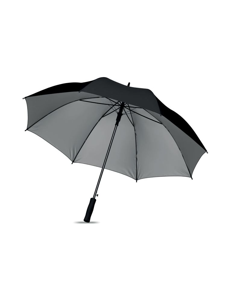 Automatycznie otwierany parasol 27’‘ z poliestru 190T oraz wewnętrzną srebrną warstwą. Czarny metalowy trzon i żebra. Plastikowe końcówki. Prosta rączka z EVA. Manualne zamykanie.