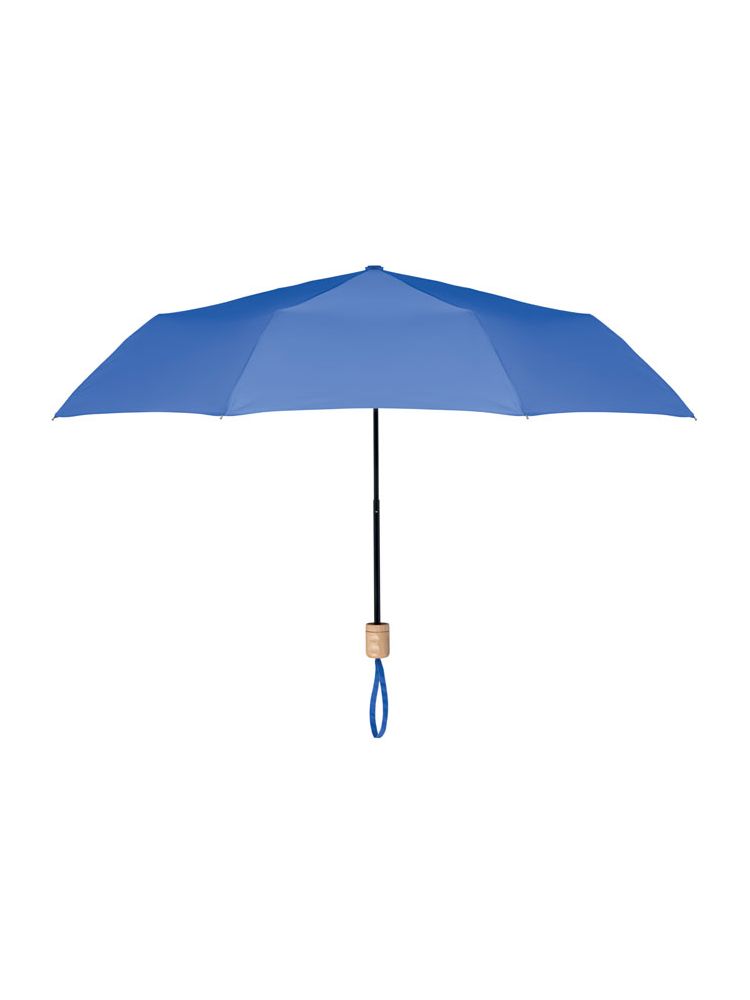 Składany parasol 21 cali, 3 sekcje z tkaniną pongee 190T RPET, czarny stelaż i żebra. Z drewnianą rączką. Ręczne otwierany i zamykany. Etui z tego samego materiału.