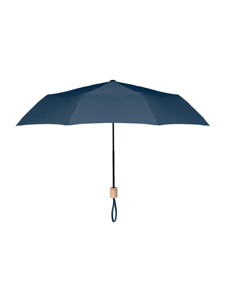 Składany parasol 21 cali, 3 sekcje z tkaniną pongee 190T RPET, czarny stelaż i żebra. Z drewnianą rączką. Ręczne otwierany i zamykany. Etui z tego samego materiału.