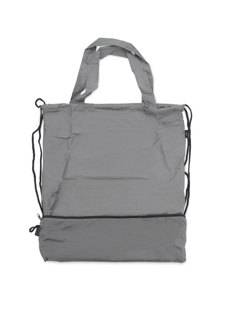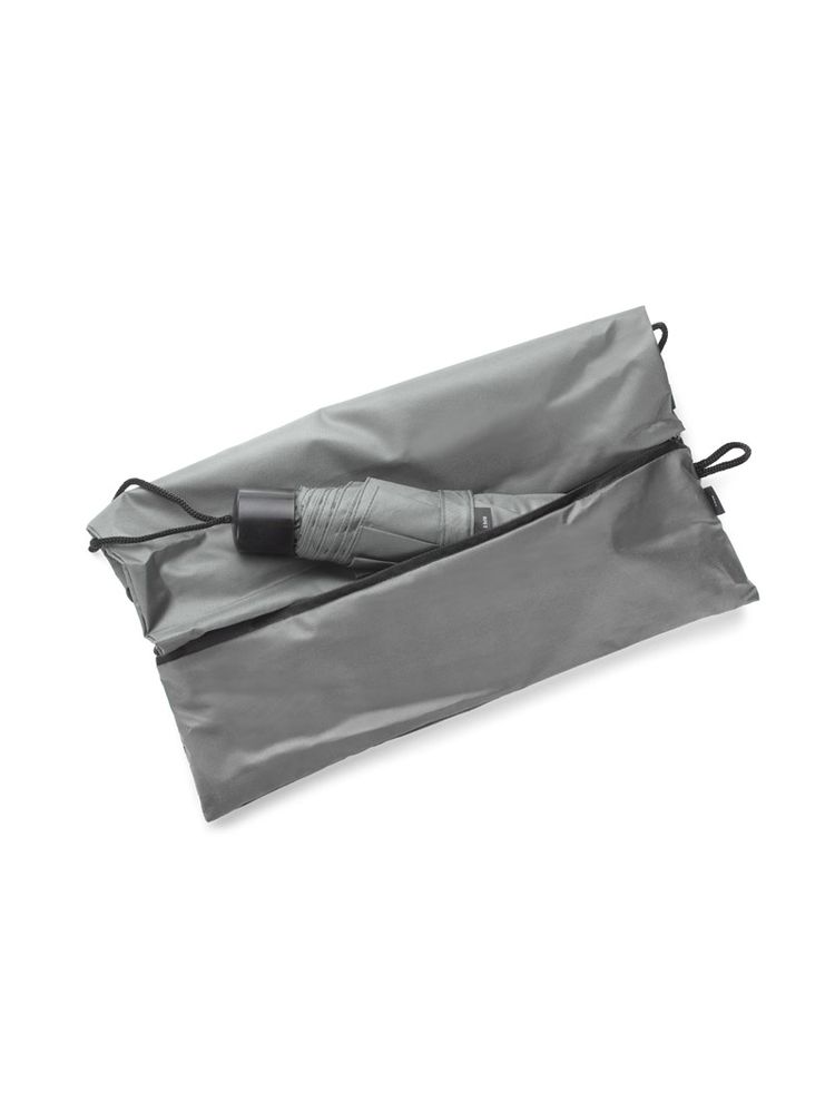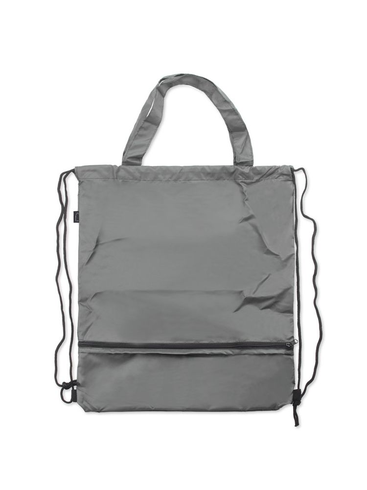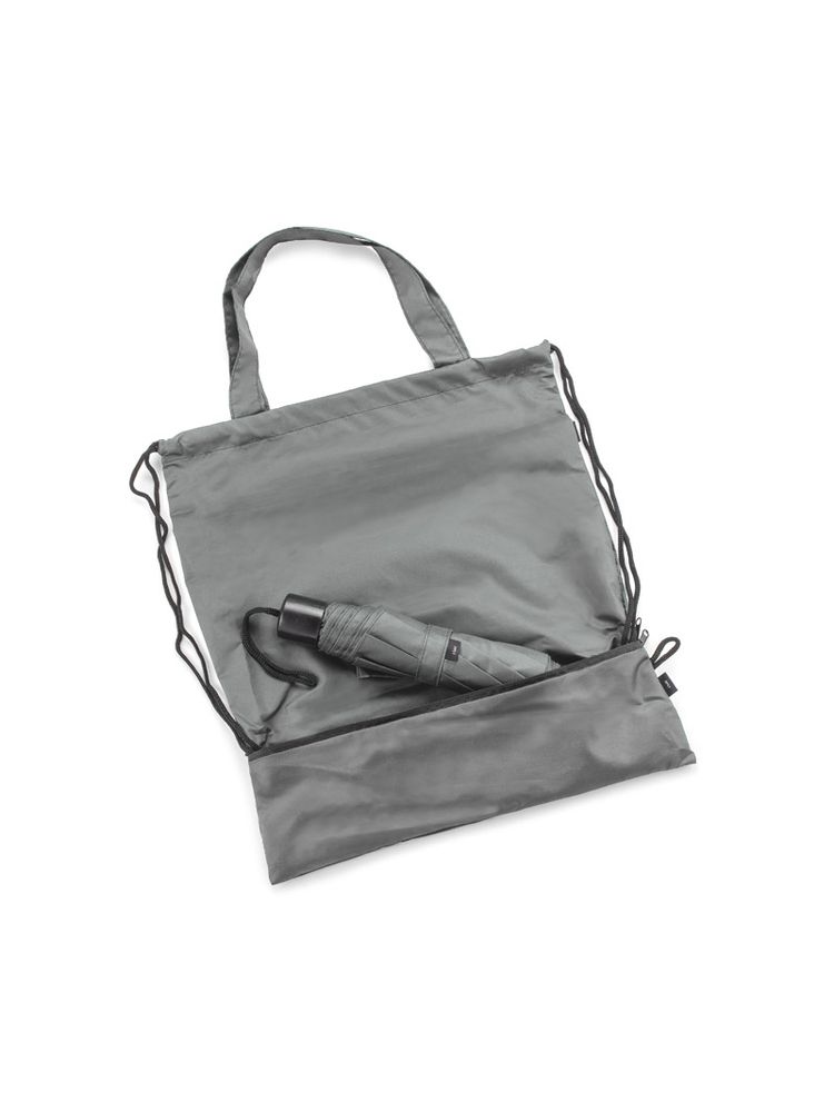 Worek na sznurkach z parasolem RAINY wykonany jest z poliestru RPET, co czyni go bardziej przyjaznym środowisku. Środek worka jest jednokomorowy. Oprócz tradycyjnych sznurków posiada jeszcze rączki o długości 44 cm, dzięki czemu może być używany także jako torba na zakupy. Na dole worka znajduje się zamykana na zamek kieszeń, w której schowany jest dołączony do zestawu parasol, także wykonany z poliestru RPET.