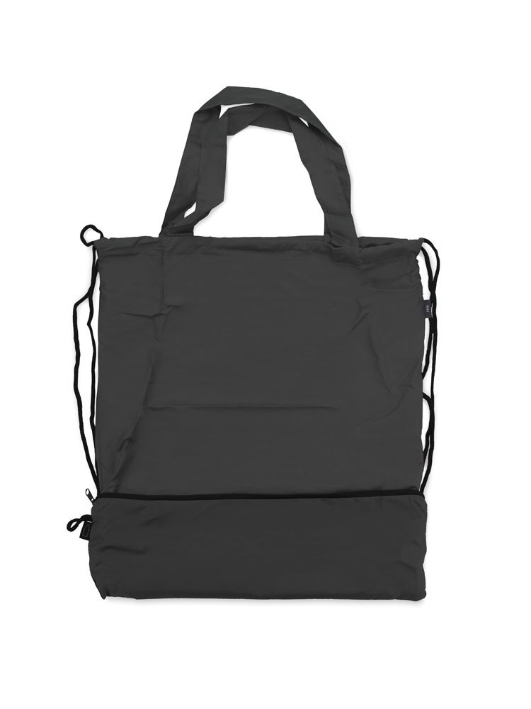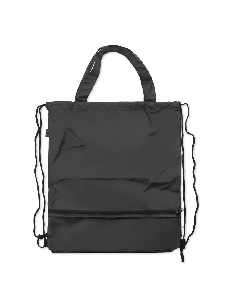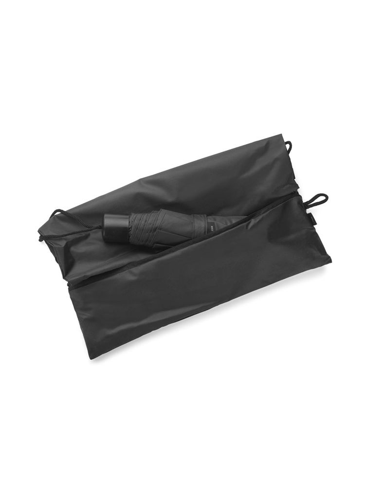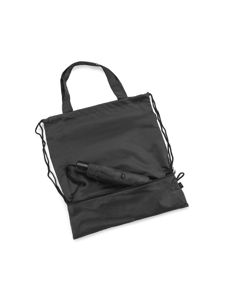Worek na sznurkach z parasolem RAINY wykonany jest z poliestru RPET, co czyni go bardziej przyjaznym środowisku. Środek worka jest jednokomorowy. Oprócz tradycyjnych sznurków posiada jeszcze rączki o długości 44 cm, dzięki czemu może być używany także jako torba na zakupy. Na dole worka znajduje się zamykana na zamek kieszeń, w której schowany jest dołączony do zestawu parasol, także wykonany z poliestru RPET.