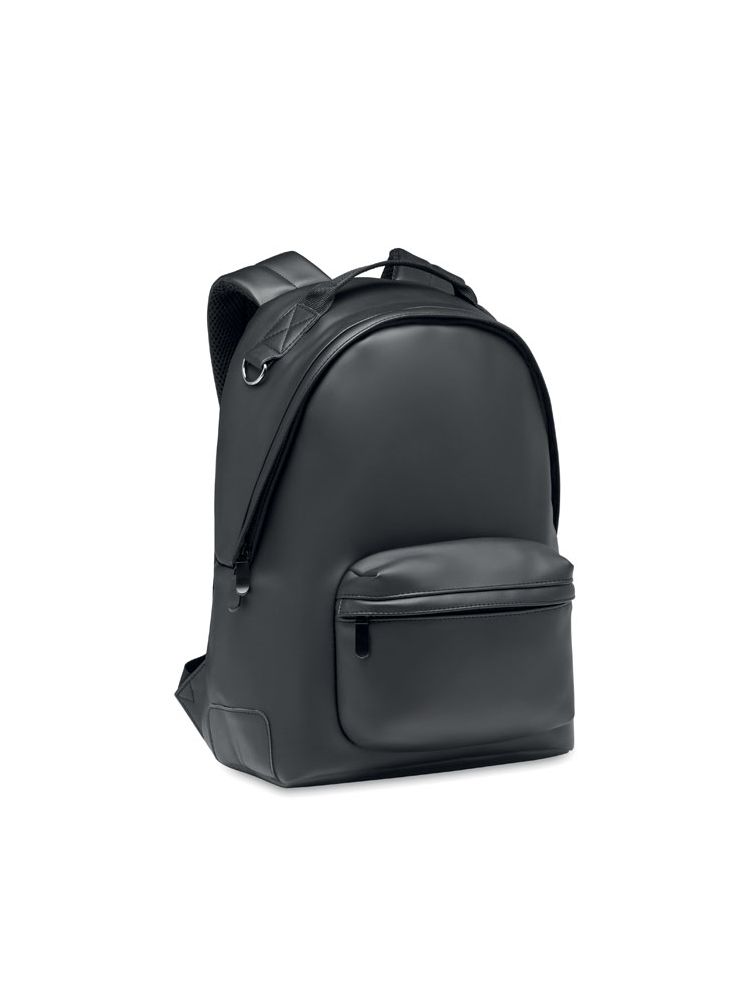 15-calowy plecak na laptopa z miękkiego PU z wyściełanym tyłem i wzmocnioną podstawą. Przednia kieszeń zapinana na zamek. Podszewka 210D RPET.