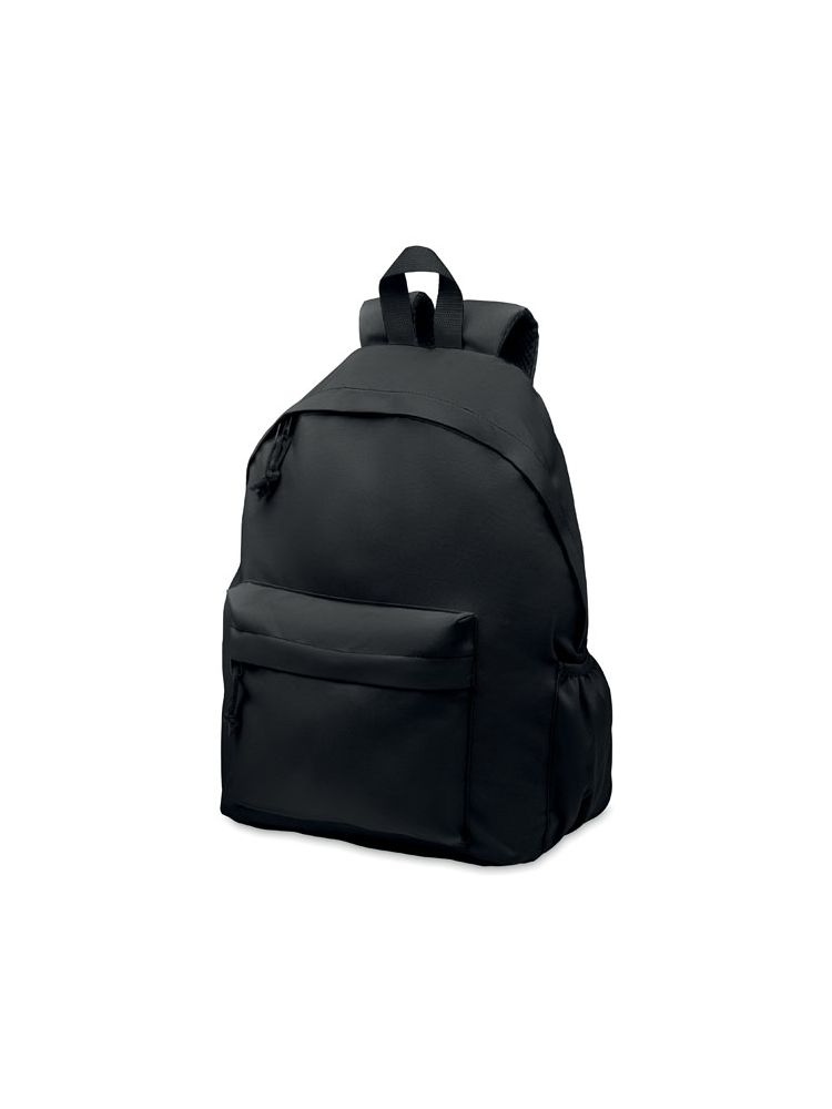 Plecak z poliestru 600D RPET z zewnętrzną kieszenią na zamek. Wyściełany tył i boczna przegródka na butelkę.