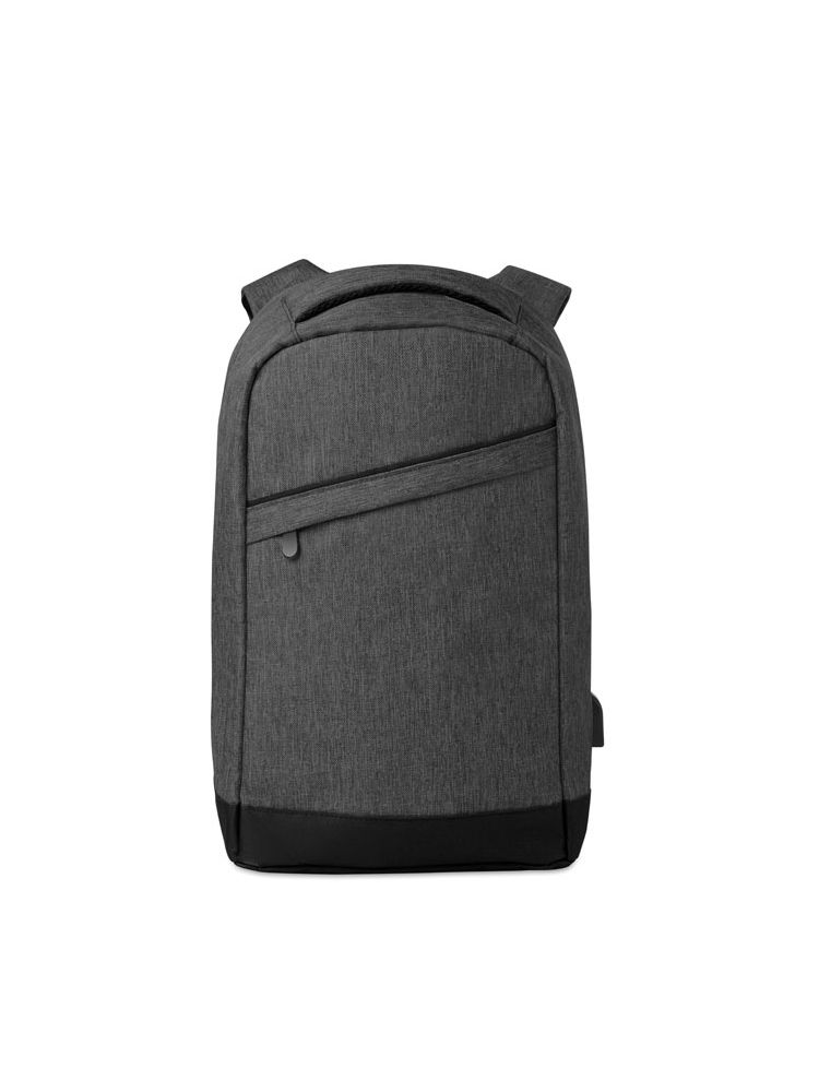 Plecak z poliestru 600D. Wyściełane paski na ramiona, wewnątrz jedna główna przegroda na laptop 13 inch oraz kabel ładujący USB. Sposób umieszczenia zamka chroni przed kradzieżą.