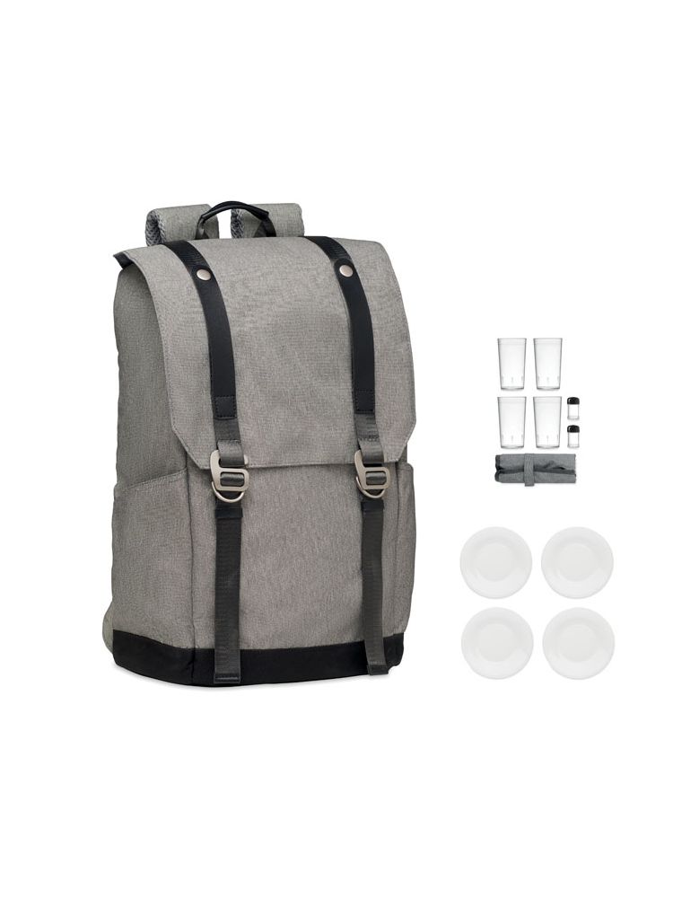 Plecak piknikowy dla 4 osób z chłodzącą przegrodą bazową, z wysokiej jakości sztućcami i 1 korkociągiem w stylu kelnerskim. Torba z poliestru barwionego kationowo. Korek jest materiałem w 100% naturalnym. Ze względu na jego strukturę i porowatość powierzchni ostateczny wygląd nadruku na każdym artykule może się różnić.
