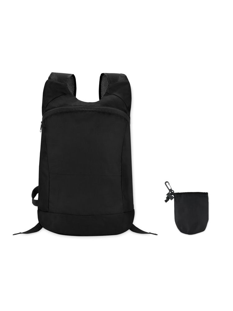 Składany plecak sportowy z poliestru Ripstop z zapinaną na zamek przednią komorą, siatkowym paskiem na ramię i dołączanym odpinanym pokrowcem.