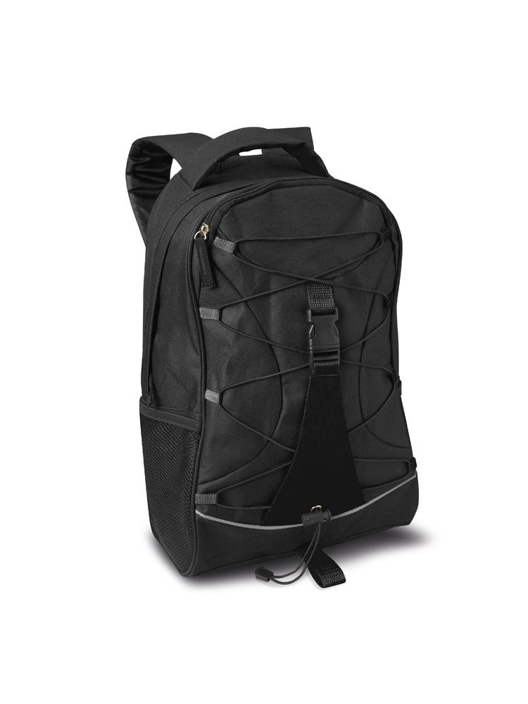 Czarny plecak z kolorową, kontrastową wkładką i dekoracyjną linką z przodu, boczne kieszenie z siatki. Wykonany z poliestru 600D.
