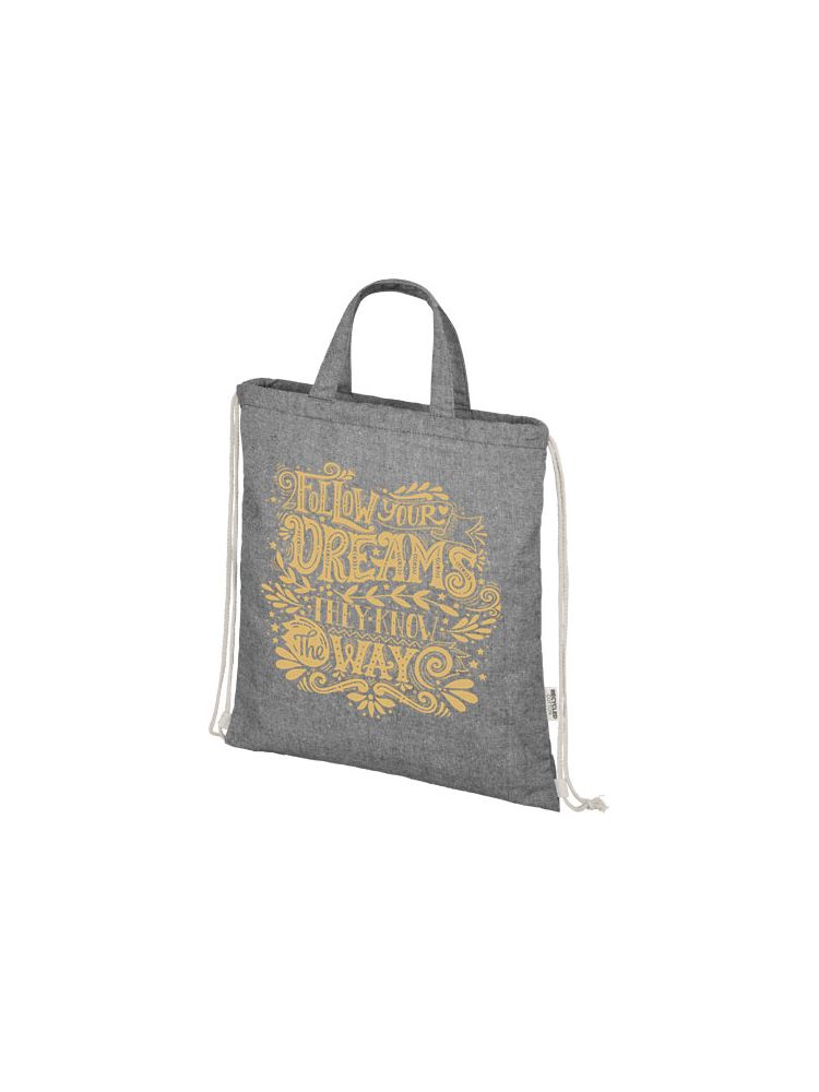 Plecak ściągany sznurkiem wykonany z mieszanki bawełny i poliestru pochodzących z recyklingu o gramaturze 150 g/m². Duża komora główna z bawełnianym sznurkiem ściągającym w kolorze naturalnym. Bawełna poddana recyklingowi pochodzi z tzw. wstępnych odpadów konsumpcyjnych wytwarzanych przez zakłady włókiennicze w trakcie procesu cięcia. Podobne kolory są mieszane ze sobą, więc nie jest wymagane dodatkowe barwienie. Ze względu na charakter bawełny pochodzącej z recyklingu mogą występować niewielkie różnice w kolorze. Dodaje to bardziej autentycznego wyglądu. Do każdego plecaka dołączony jest również znacznik Aware™. Ta innowacyjna funkcja pozwala użytkownikom prześledzić za pomocą kodu QR pochodzenie produktu i pokonaną przez niego drogę, zwiększając przejrzystość łańcucha dostaw i wspierając silniejszy związek między produktem a jego procesem produkcyjnym. Wytrzymałość do 5 kg. Długość uchwytu: 14 cm.