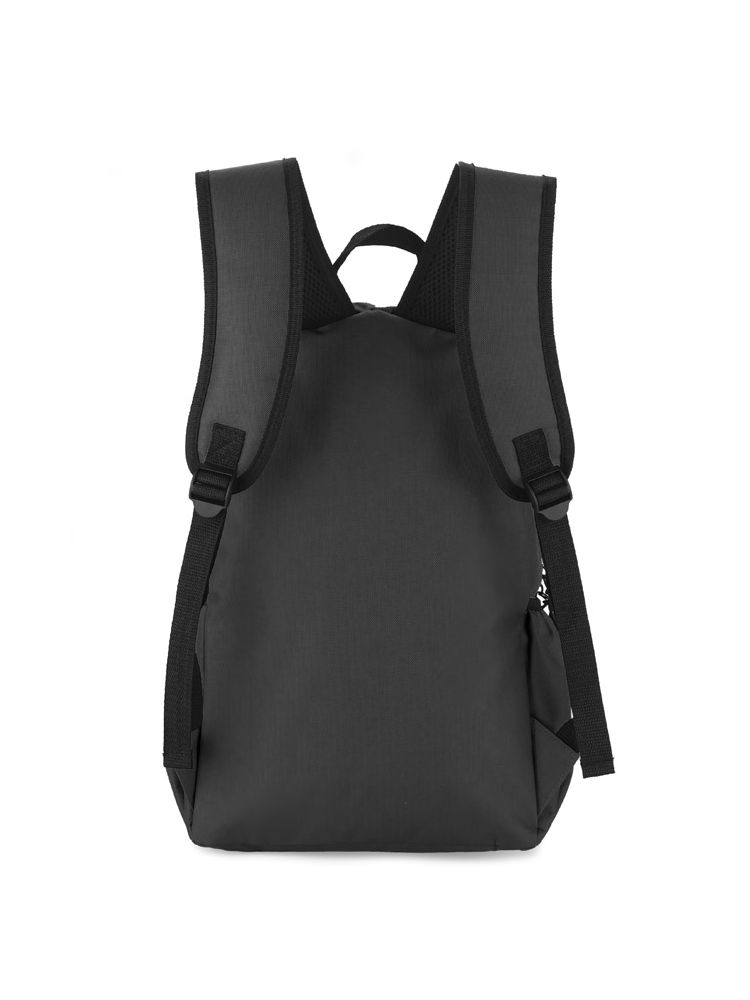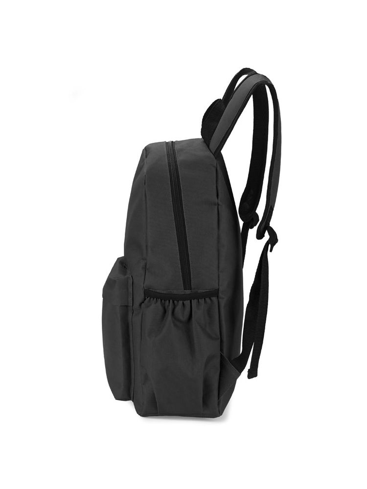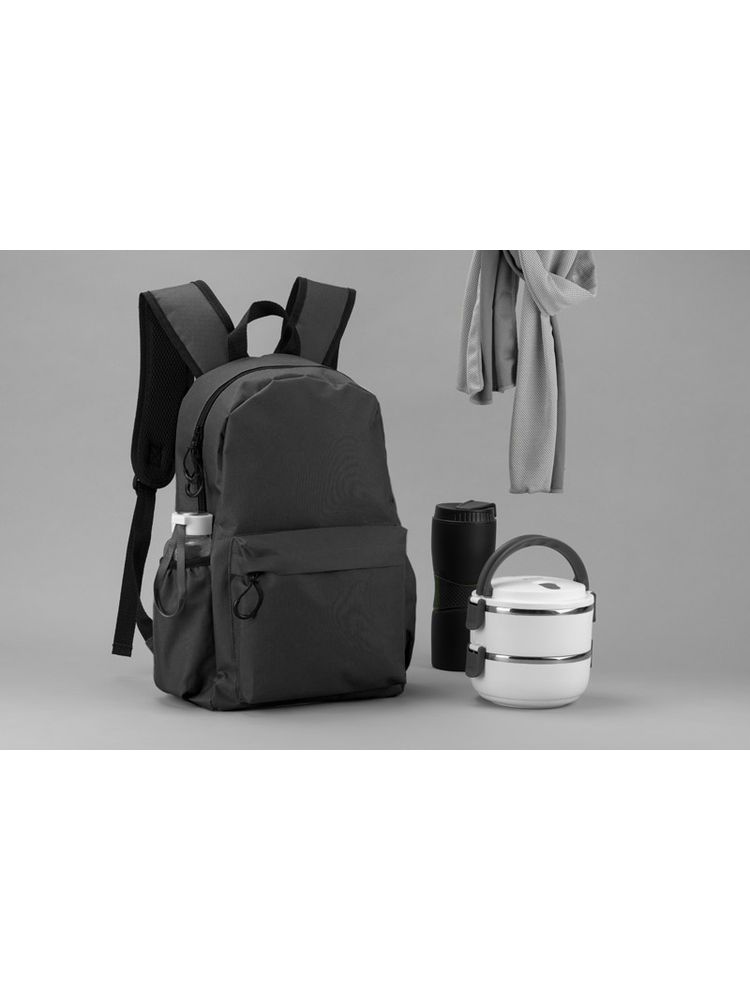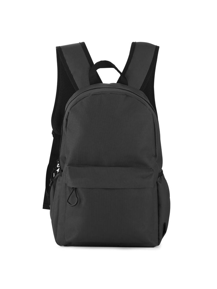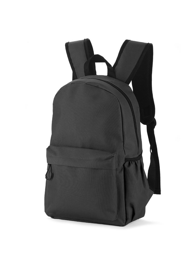 Plecak GINNI wykonany jest z poliestru 600D. Posiada jedną komorę główną zapinaną dwoma suwakami. Z przodu znajduje się spora kieszeń zapinana na zamek, która pomieści potrzebne drobiazgi. Po obu stronach znajdują się otwarte przegrody z gumką mieszczące bidon z wodą. Dno i plecy nie są usztywniane.
