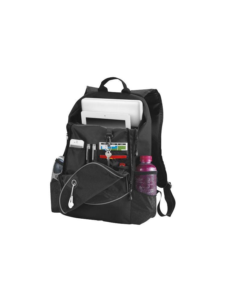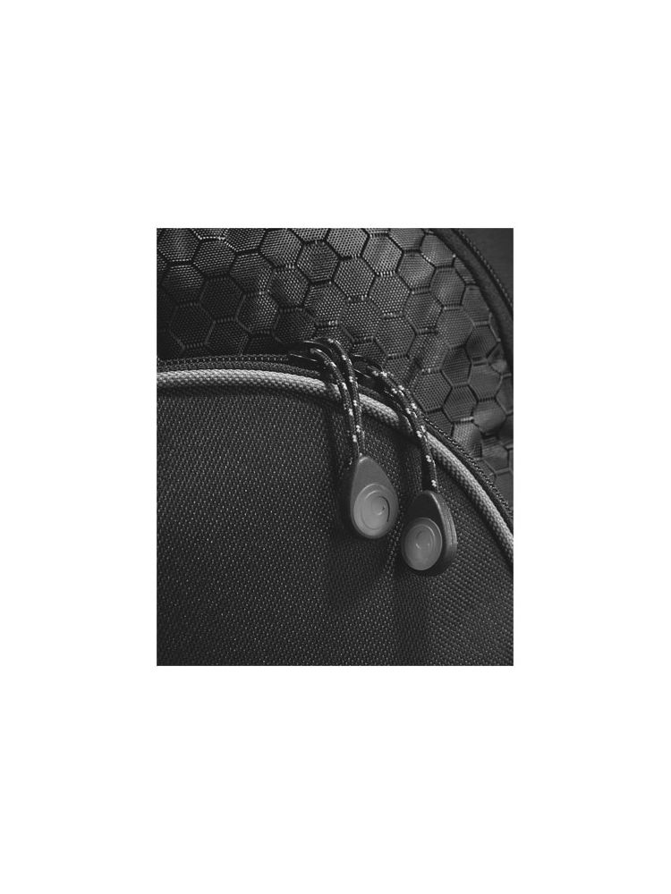 Zapinana na zamek przegroda główna zmieści większość laptopów 15”, posiada dodatkowo wyściełaną przegrodę na iPad lub tablet. Duża kieszeń przednia, zapinana na zamek, posiada przegródki oraz wyjście na słuchawki. Dwie boczne kieszenie. Wzmocniona rączka i regulowane, wyściełane szelki. Nie zawiera akcesoriów.