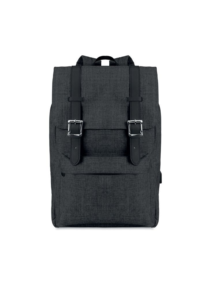 Plecak na laptop z poliestru 600D z wyściełanymi paskami na ramiona, główna komora na laptop 15-calowy, kabel USB do ładowania. Zawiera zapięcie na zatrzask magnetyczny i jedną przednią kieszeń zapinaną na suwak.