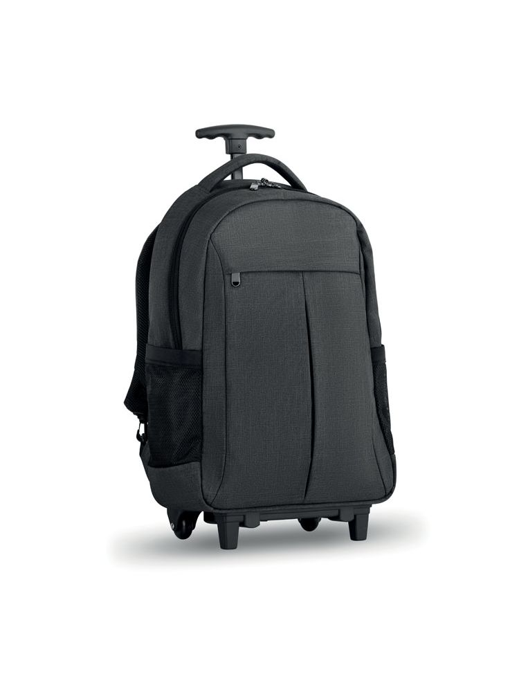 Plecak z kółkami, z poliestru 360D. Wewnątrz komora na laptop 15’‘, przednia komora z kieszenią na suwak, przegroda na tablet. Wyściełane plecy oraz pasy na ramiona. Zintegrowana osłona na kółka.