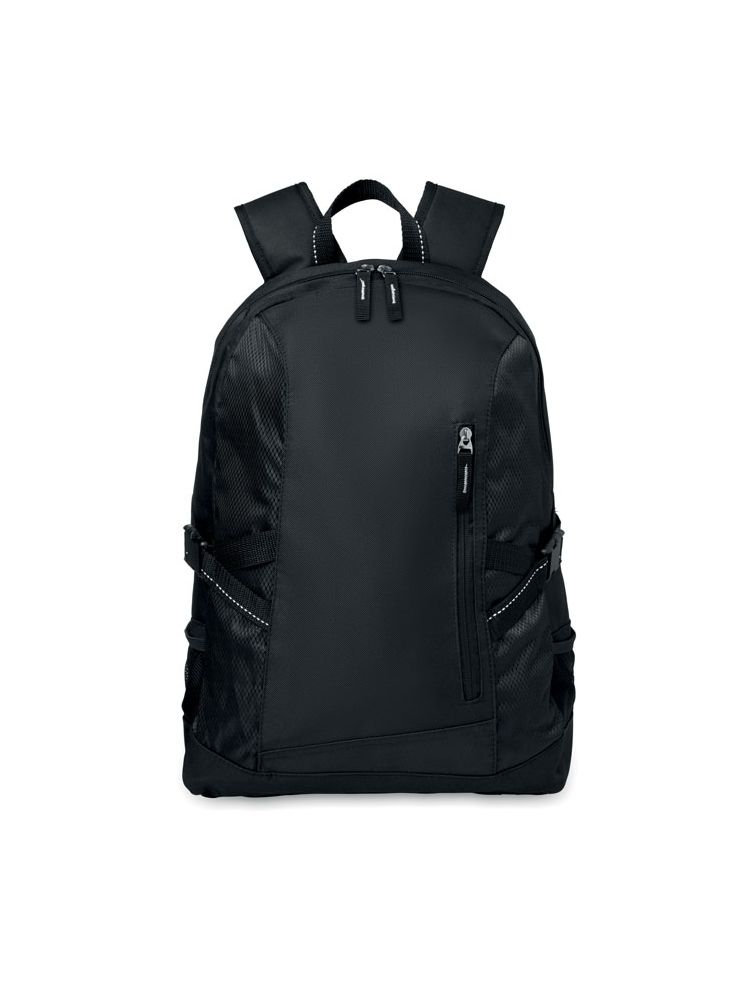 Plecak na laptop 15’‘ z poliestru 600D z wodoszczelnymi elementami. Zawiera 1 przegrodę na laptop 15’‘, 1 przednią kieszeń na zamek oraz 2 boczne kieszenie. Regulowane paski na ramiona.