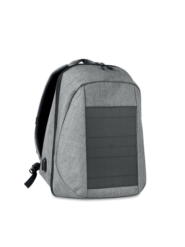 Plecak z poliestru 600D z wbudowaną ładowarką solarną, z portem USB i kablem. Czas ładowania ok. 5-6h. 2 główne przegrody. Przegroda na laptop 13’‘, wyściełane paski na ramiona oraz plecy oraz dodatkową kieszeń na tablet.