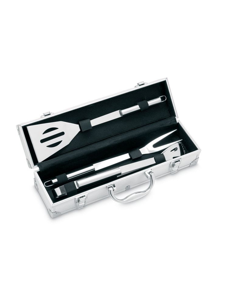 Aluminiowa walizka z 3 akcesoriami do barbecue ze stali nierdzewnej. Miejsce na nadrukowanie logo.
