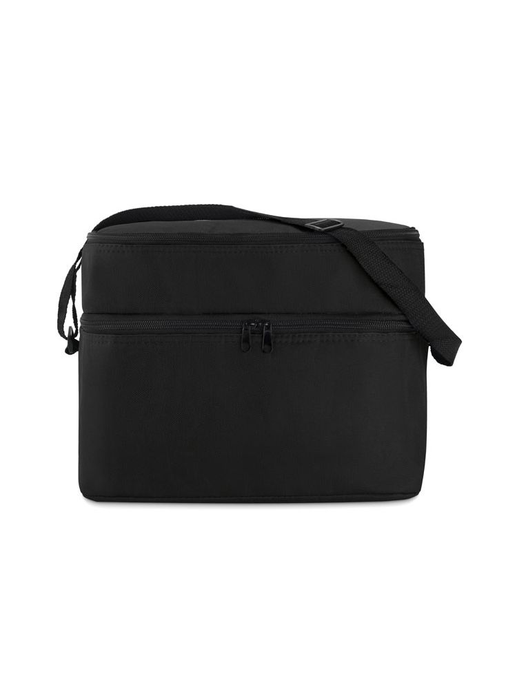 Torba termiczna 600D z 2 przegrodami wyściełanymi folią aluminiową. Posiada regulowany pasek na ramię.