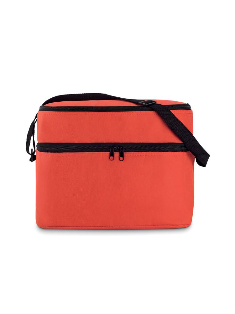 Torba termiczna 600D z 2 przegrodami wyściełanymi folią aluminiową. Posiada regulowany pasek na ramię.