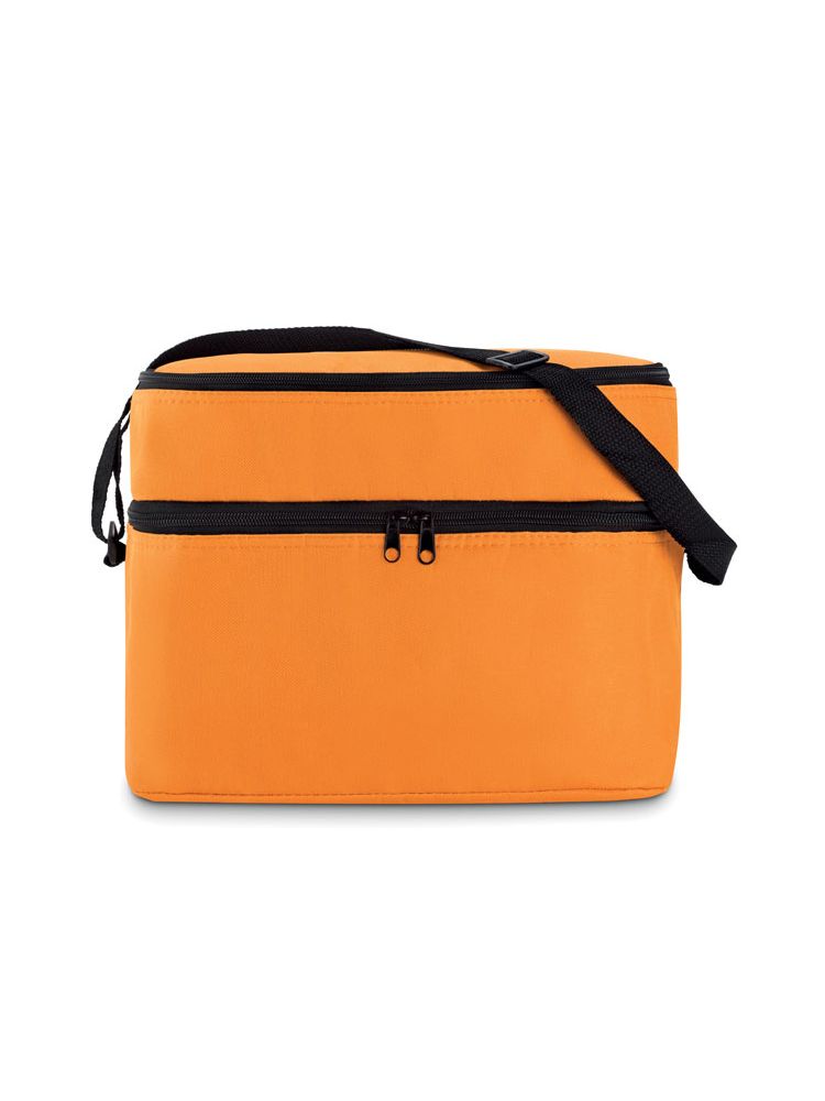 Torba termiczna 600D z 2 przegrodami wyściełanymi folią aluminiową. Posiada regulowany pasek na ramię.